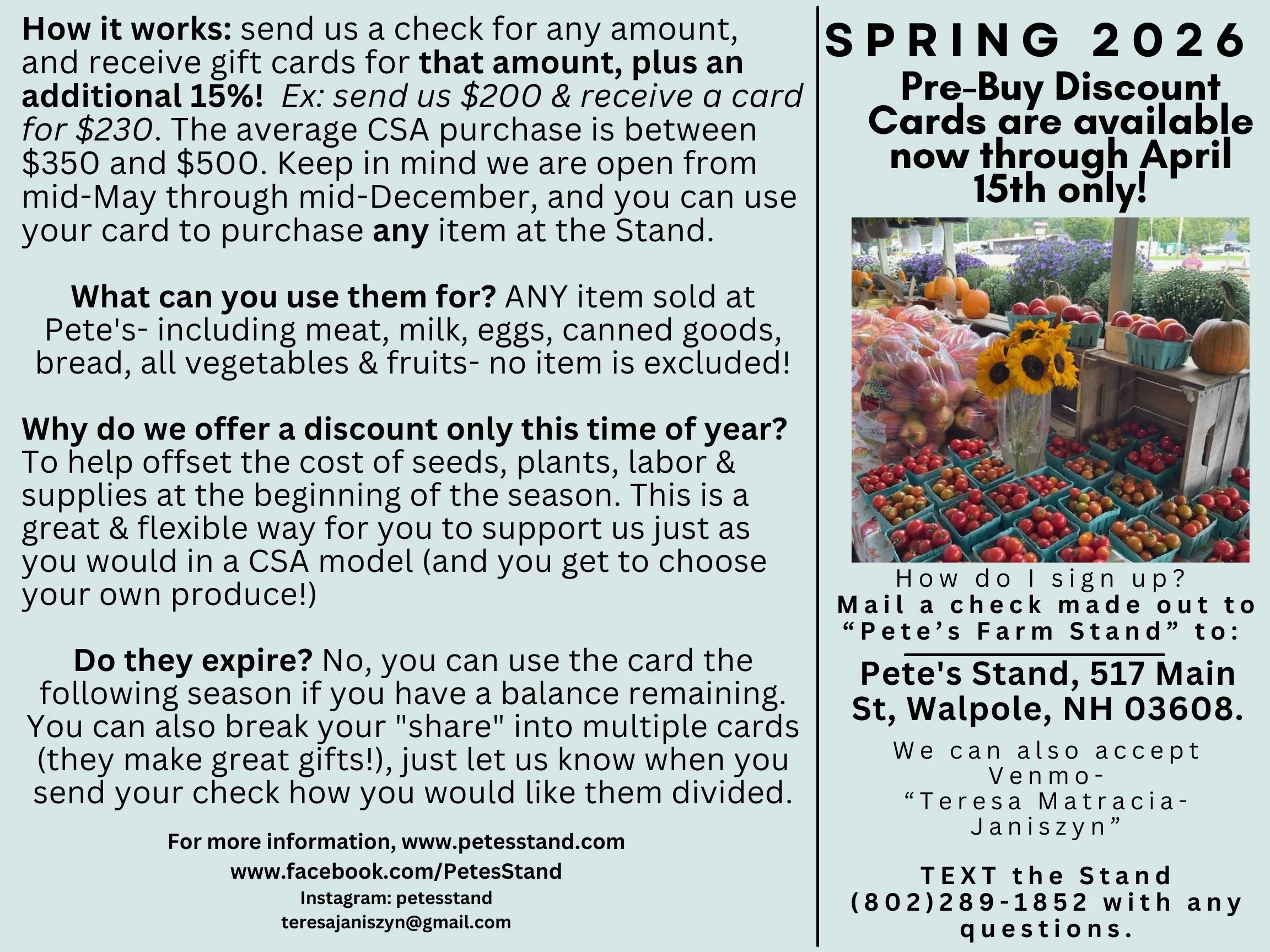 Details for 2026 season: CSA cards are issued as gift cards and can be made in any amount. Because there are no restrictions on what can be purchased, we can only accept cash, check, venmo, or credit cards as payment for CSA (no EBT/SNAP). Cards are not replaceable and should be treated as CASH. They are not refundable, but they do not expire. Checks should be made out to “Pete’s Farm Stand” and mailed to us at Pete’s Stand- 517 Main St., Walpole, NH 03608. If you would like to use venmo, please send funds to @Teresa-Matracia-Janiszyn.