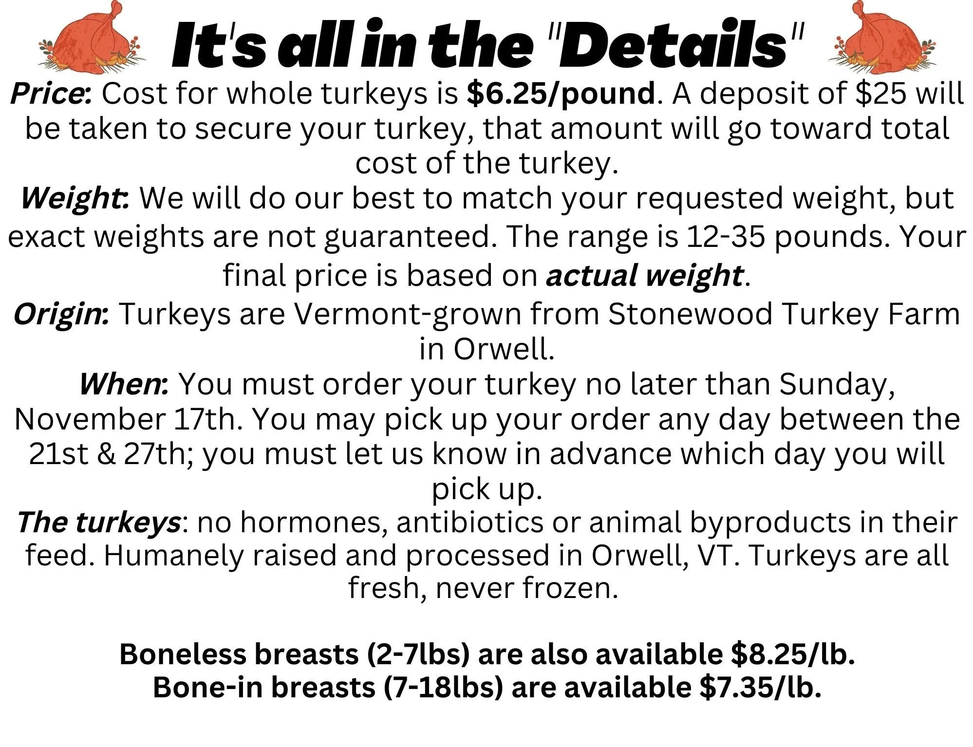Now accepting orders for turkeys for Thanksgiving! Stop by the farm stand & place your order. You can pick up your Vermont-grown, fresh (never frozen) turkey any day between November 19th (the week before Thanksgiving- for those of you hosting gatherings on the weekend prior) to the 26th (the day before Thanksgiving). We will be open 9-6 daily during the leadup to the holiday and closed on Thanksgiving. Please read details below, & for more information on Stonewall Farm follow the links provided. After Thanksgiving, we will re-open with “winter hours” 10-6 daily, staying open later on Friday & Saturday evenings as needed. We will close for the season in mid-December.